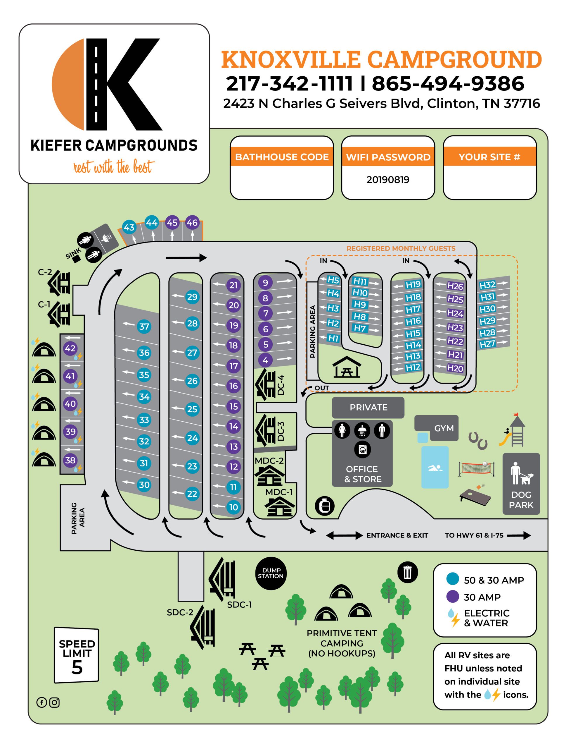 Knoxville Campground has a variety of RV site options. Need a 50-amp hookup? We have it. Need sewer, water, and electric? We have it. Our sites are big rig friendly, and we also have pull through spots for easy in and out.